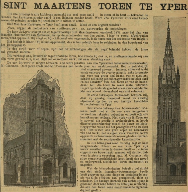 Dit verheugt ons, immers de tegenwoordige toren, hoe schoon hij ook is, en niettegenstaande wij aan zijn vorm gewoon zijn, is en blijft het een onvoltooid werk dat naar afwerking snakt. De eer om dit werk te mogen afmaken is te beurt gevallen aan de befaamde Ieperse bouwmeester M. Coomans. Over jaren reeds had M. Coomans een eerste plan van naald gemaakt. Het is gelukkig niet uitgevoerd geweest: immers, hoewel in dit eerste ontwerp de overlevering inzake torenspitsen voor een groot deel inbegrepen zat, was er nochtans minder rekening gehouden met de aard en het karakter van de toren en van de kathedraal zelf, die beide in zekere mate, uitzonderlijk zijn onder de grote kerken van Vlaanderen: met een woord: de eenheid was niet volmaakt.