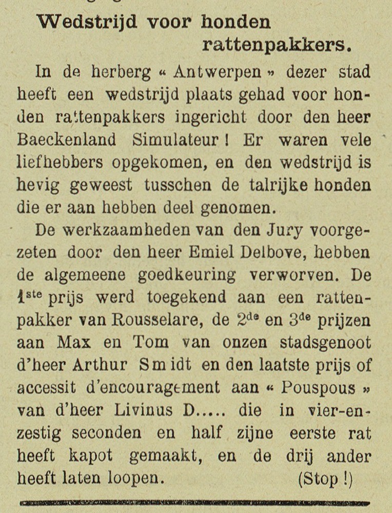 In de herberg ‘Antwerpen’ van deze stad heeft een wedstrijd plaatsgehad voor honden rattenpakkers, ingericht door de heer Baeckenland Simulateur!