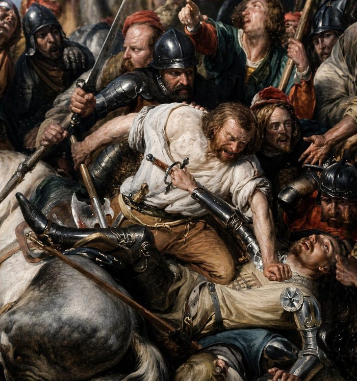 Maar de gildebroeders van Brugge en Gent staan zo vast als muren. Ze vormen allen samen een hechte en aaneengesloten dam tegen de prachtig uitgedoste Franse ruiters. Nadat ze de grootste Franse driftkikkers in het stof hebben doen bijten rukken ze op hun beurt vooruit. Hun goedendags vallen en dreunen verpletterend op de lichamen van de ruiters en de voetknechten.